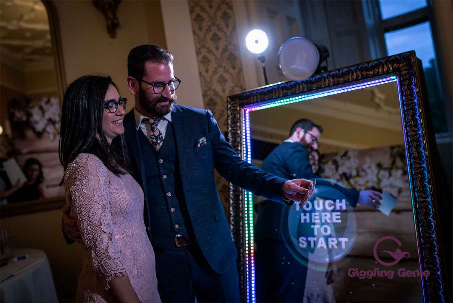 Giggling Genie’s Vintage magic mirror made from wood has a beautiful, ornate design. It is a touch-screen mirror that allows guests to take photos, add filters and effects, and print them out on the spot. Magic mirror photo booths are a popular choice for events of all sizes, including weddings, birthdays, corporate events, and trade shows.